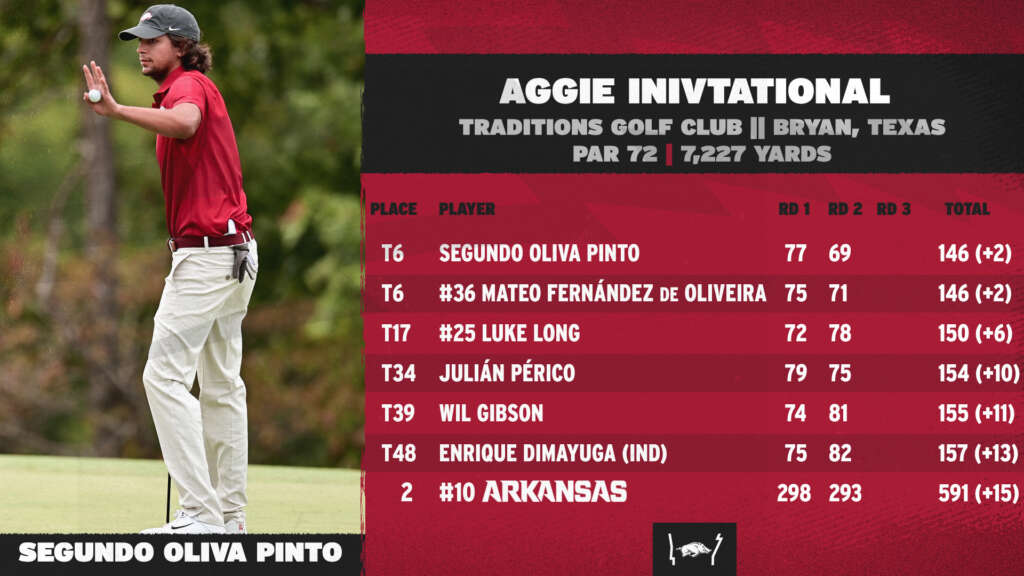 BRYAN, Texas – The 10th-ranked Arkansas men’s golf program played 36 holes and used an impressive second round to stand in second (298-293=591) at the Aggie Invitational, played at the Traditions Golf Club (par 72, 7.227 yards).