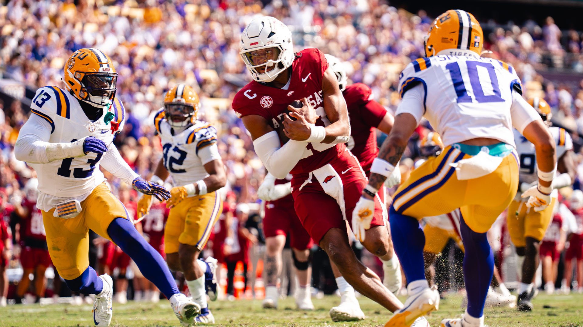 1 – QB Taylen Green has completed 182-of-293 (62.1%) passes for 2,537 yards and 19 touchdowns while also rushing for 719 yards and seven touchdowns on 124 carries (5.8 ypc) through 10 games this season. The Razorbacks’ dual-threat quarterback ranks second nationally in yards of total offense (3,254) and is third in yards of total offense per game (325.4).