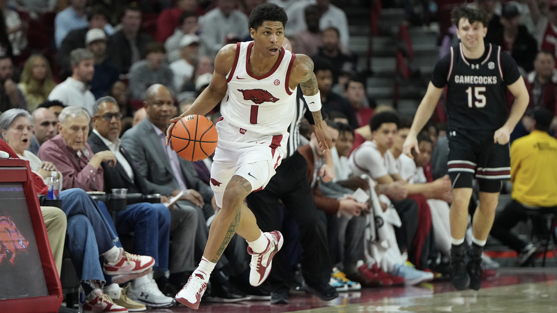 FAYETTEVILLE – Razorback rookies Meleek Thomas (21 points and four steals) and Darius Acuff Jr. (18 points and 13 assists) led #17 Arkansas to a 108-74 victory over South Carolina Wednesday night at Bud Walton Arena.