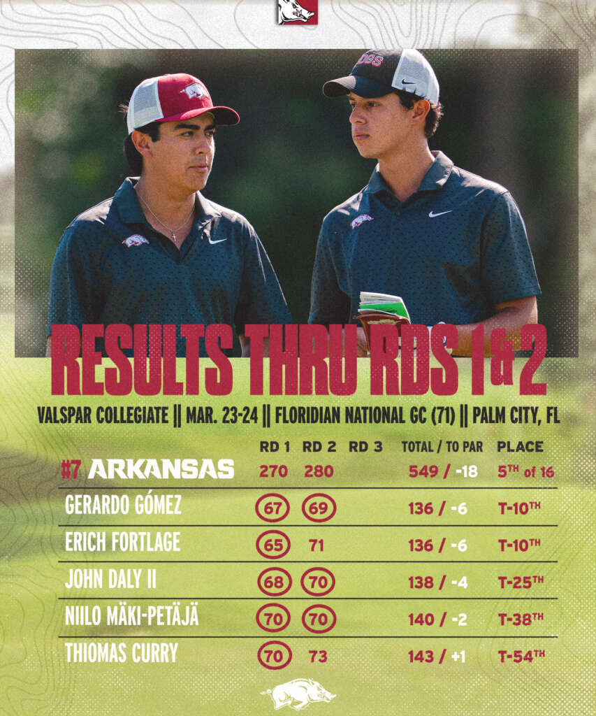 PALM CITY, Fla. – #7 Arkansas sits in fifth place after two rounds Monday in the stacked 16-team Valspar Collegiate Invitational with a 36-hole, 18-under-par score of 550 (270-280), played at the Floridian National Golf Club (par 71).