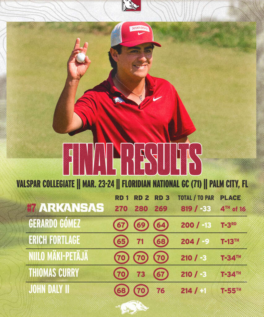 PALM CITY, Fla. – Facing one of the toughest fields in college golf, #7 Arkansas fired a final-round, 15-under-par 269 and tied a school record with a 54-hole total of 819 (-33) to place fourth at the 16-team Valspar Collegiate Invitational, played at the Floridian National Golf Club (par 71).