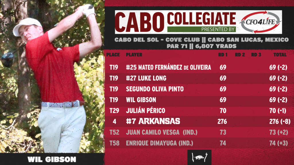 CABO SAN LUCAS, Mexico – Four Razorbacks carded a 2-under-par 69 Sunday and all five Razorbacks shot under par to lead #7 Arkansas to fourth place after day 1 with a score of 276 (-8) at the 12th annual Cabo Collegiate, presented by CFO4Life, played at the par 71 Cabo del Sol Cove Club Course.