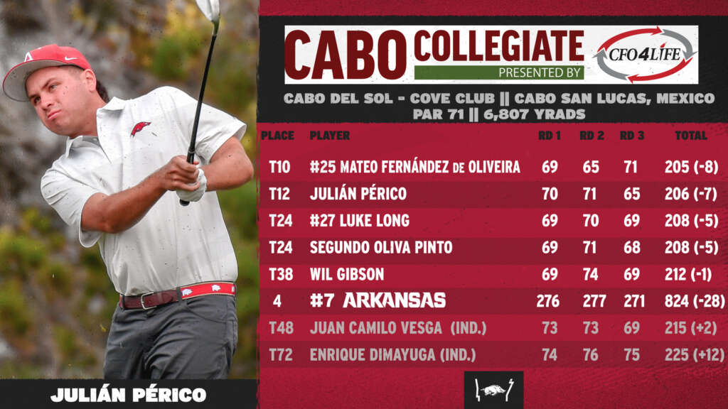 CABO SAN LUCAS, Mexico – Julian Perico shot a season-low 65 (-6) and jumped 22 spots to tie for 12 while Mateo Fernandez de Oliveira recorded his fifth top 10 (in six events) to lead #7 Arkansas to a fourth-place finish at the Cabo Collegiate, presented by CFO4Life, with a 28-under-par score of 824, four shots off the winning total.