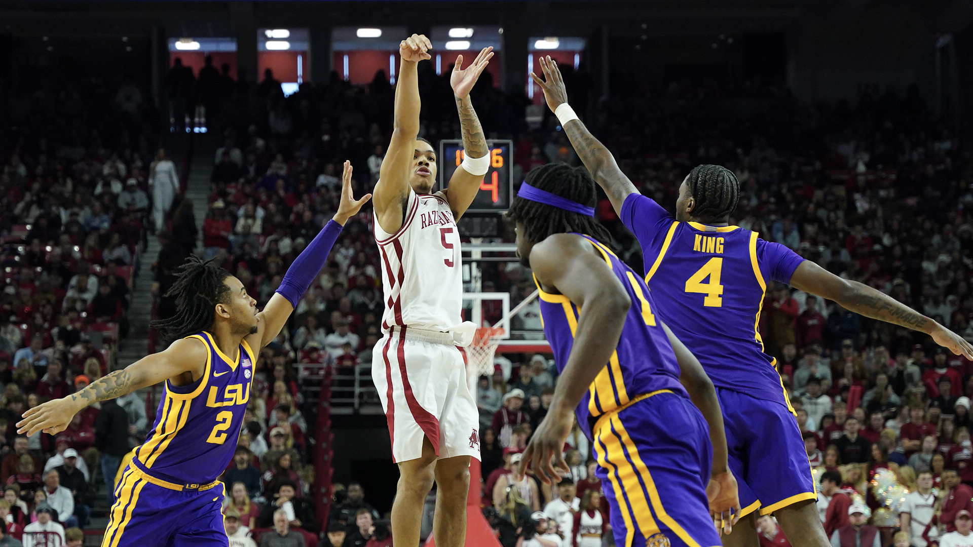 Later, Arkansas opened its advantage to seven points (79-72 with 4:12 left) on a Nick Pringle layup off an Acuff assist. LSU made a charge and trailed by two (81-79 with 1:54 left). On the ensuing possession, LSU clamped down on Acuff, who found Trevon Brazile for a dagger 3-pointer with 49 seconds left to all but secure the win. The helper to Brazile was his sixth of the game.