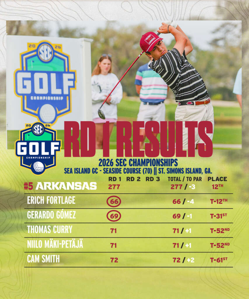 ST SIMONS ISLAND, Ga. – Erich Fortlage fired an opening-round 66 to lead #5 Arkansas after 18 holes at the 2026 SEC Championship, played at the Sea Island Golf Club’s Seaside Course (par 70). Gerardo Gomez was also under par with a 69, and the Razorbacks are in 12th with a 3-under-par 277.