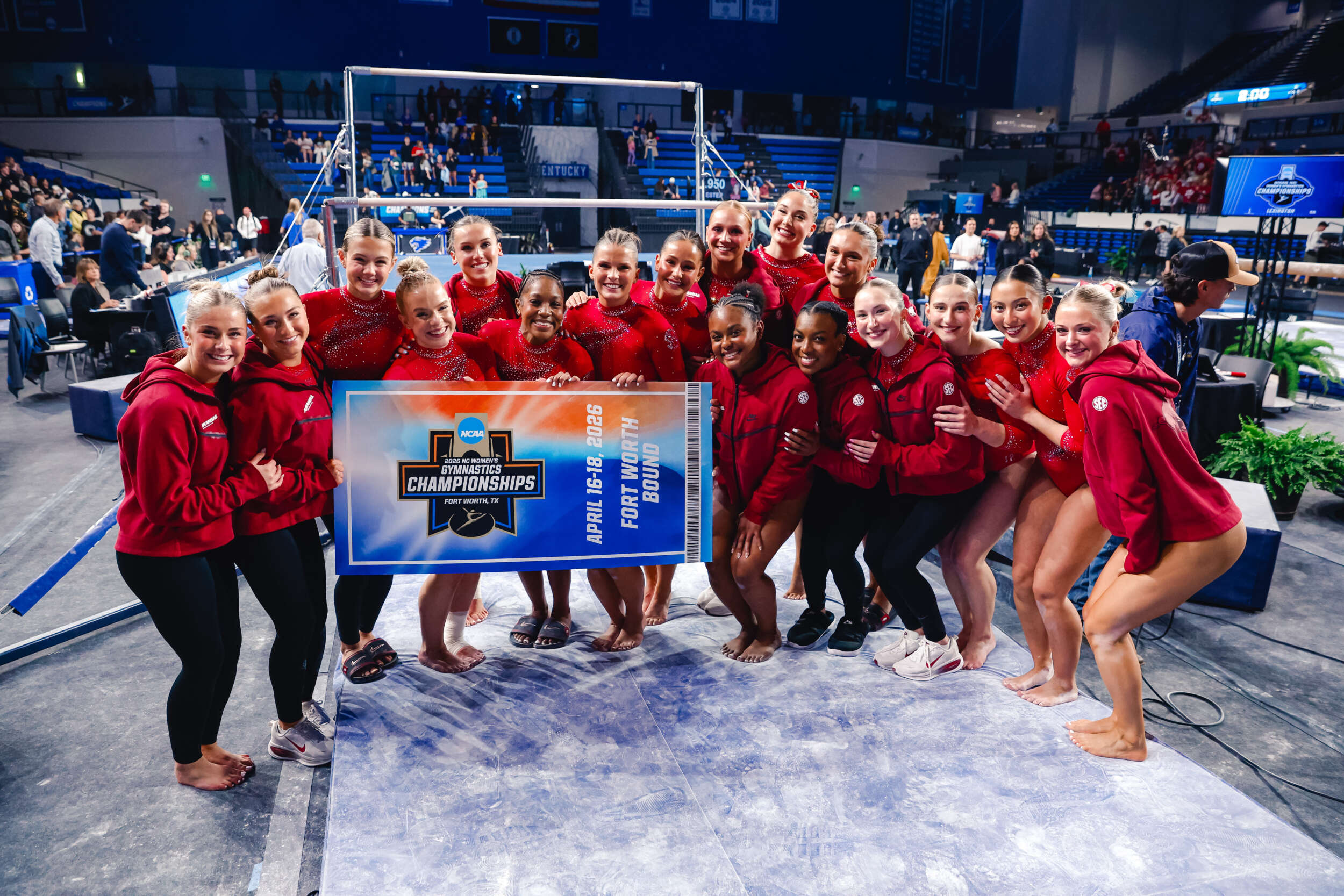 Arkansas will be joined by Oklahoma, No. 4 UCLA, and No. 13 Minnesota in the national semifinal, which is set for Thursday, April 16 at Dickies Arena in Fort Worth, with time to be announced. The other session of competition will consist of No. 2 LSU, No. 3 Florida, No. 6 Georgia and No. 7 Stanford. The top two teams from each semifinal will advance to the national final on Saturday, April 18 at 3 p.m. CT.