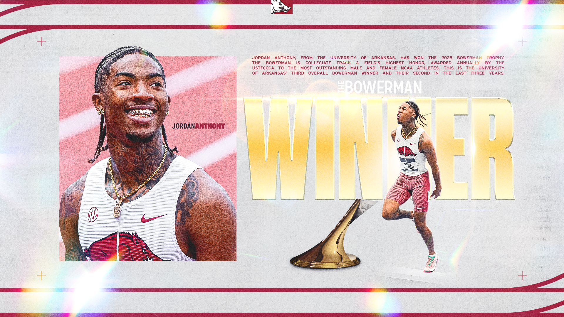 GRAPEVINE, Texas – An extraordinary season produced by Arkansas sprinter Jordan Anthony was deemed worthy of The Bowerman, collegiate track & field’s highest individual honor, as announced by USTFCCCA on Thursday evening at the Gaylord Texan Resort.