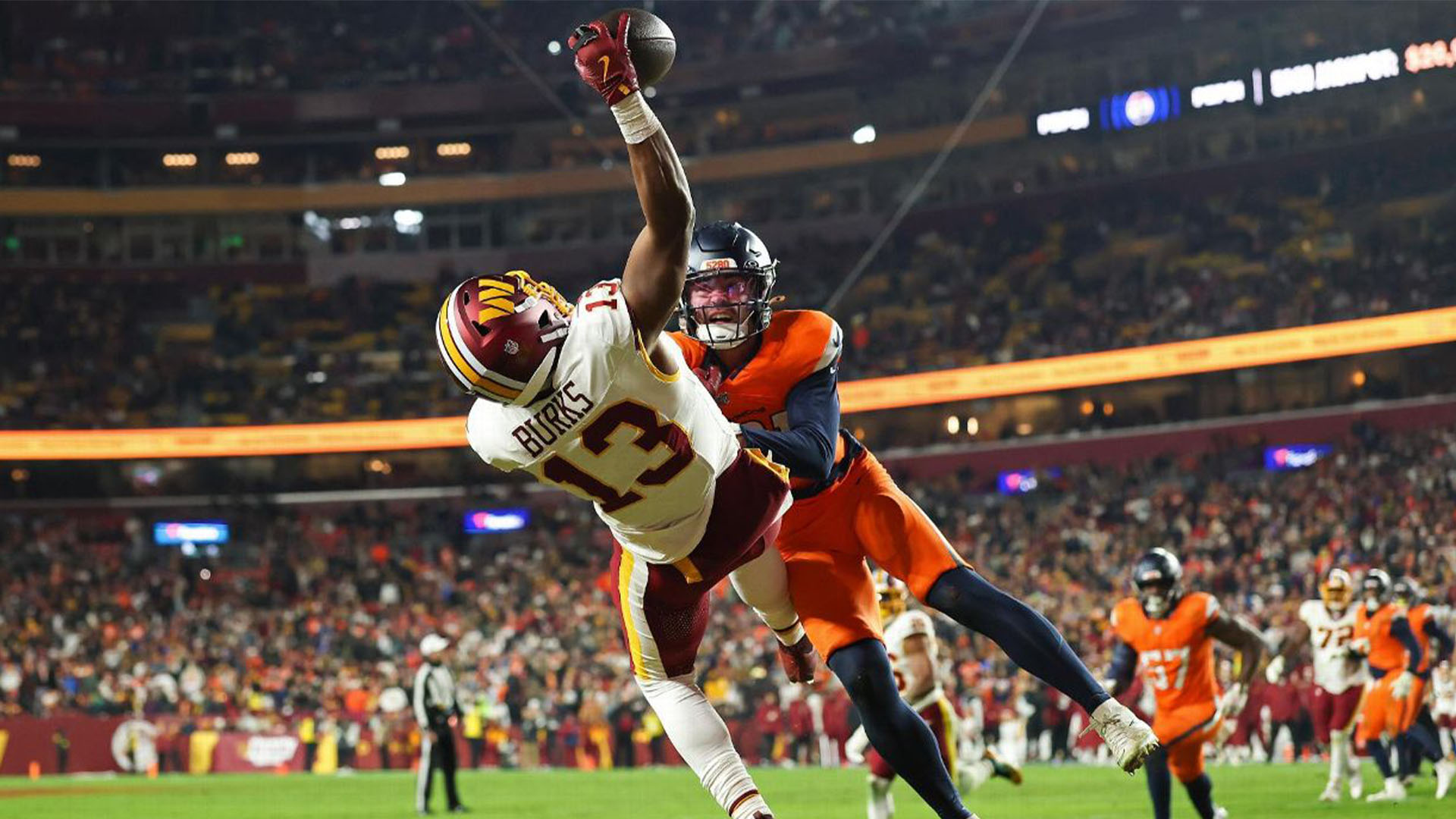 Burks made one of the most impressive plays in the NFL this season by hauling in an acrobatic one-handed five-yard touchdown reception on a pass from Marcus Mariota during the Washington Commanders’ 27-26 loss to the Denver Broncos on Sunday Night Football. The touchdown reception was the second of his career and his first since he hauled in a 25-yard pass during a 35-10 loss to the Philadelphia Eagles while playing for the Tennessee Titans on Dec. 4, 2022.