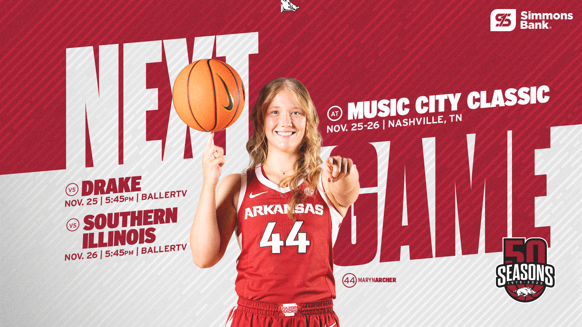 The Hogs will face Drake (1-3) on Tuesday, Nov. 25 and Southern Illinois (2-2) on Wednesday, Nov. 26. Both games will tip off at 5:45 p.m. and will be streamed on BallerTV.