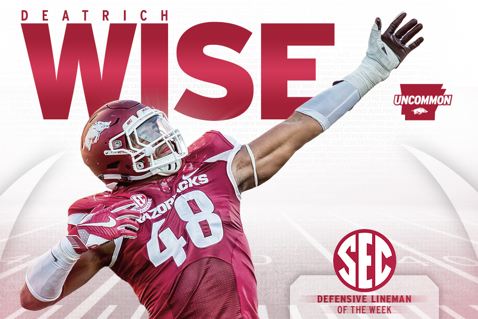 BIRMINGHAM, Ala. – Arkansas senior Deatrich Wise Jr. has been named Southeastern Conference Defensive Lineman of the Week for his performance in the Razorbacks’ 21-20 season-opening victory against Louisiana Tech, the league office announced Tuesday.