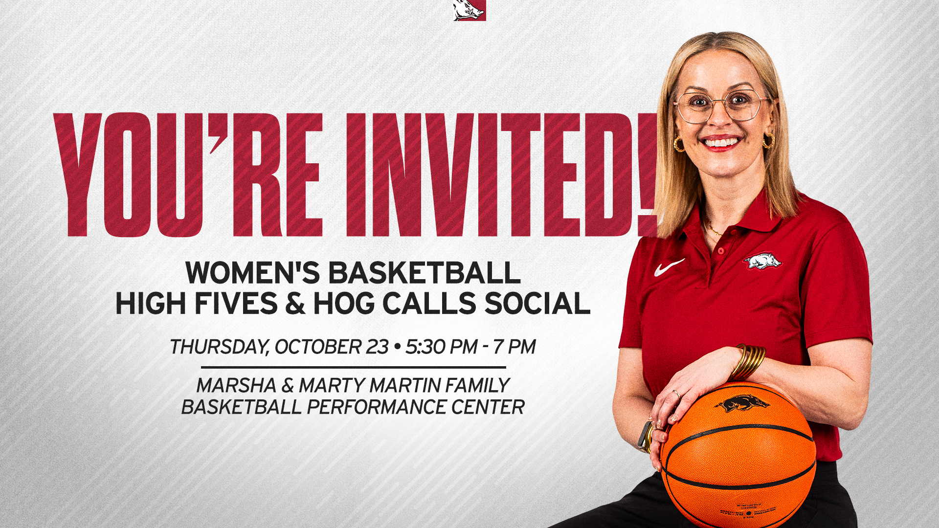Razorback Women’s Basketball Head Coach Kelsi Musick is inviting all current season ticket holders and fans interested in purchasing tickets to a special High Fives & Hog Calls Social event on Thursday, October 23, at 5:30 p.m. inside the Marsha and Marty Martin Family Basketball Performance Center.